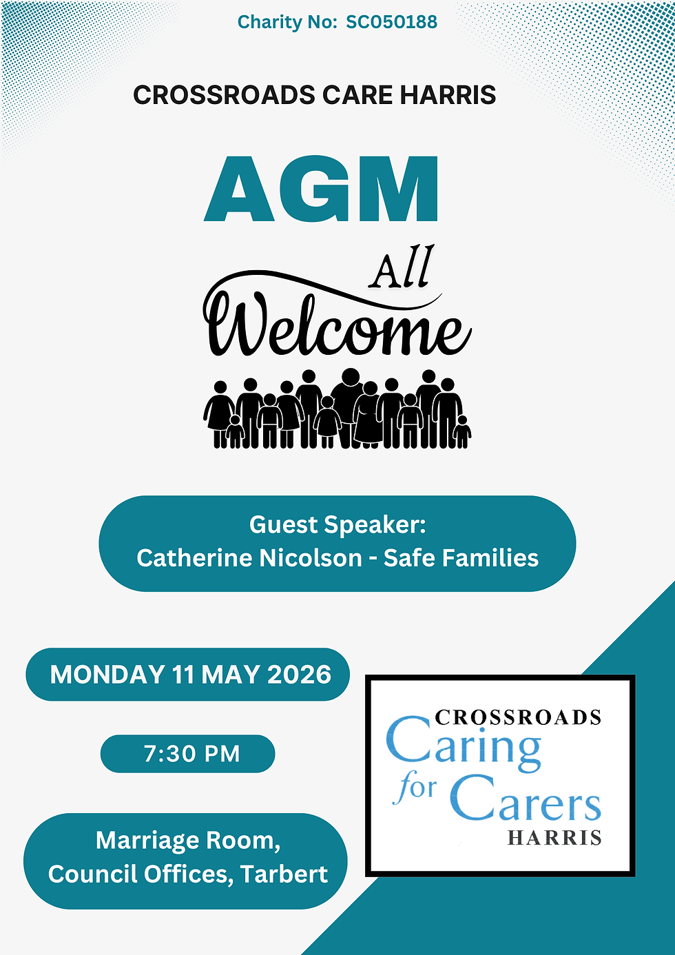 Crossroads Care Harris is funded by Curam is Slainte nan Eilean Siar, Catherine M Macleod Trust, Councillors Ward Fund, Harris Charity Shop, voluntary donations and fundraising.